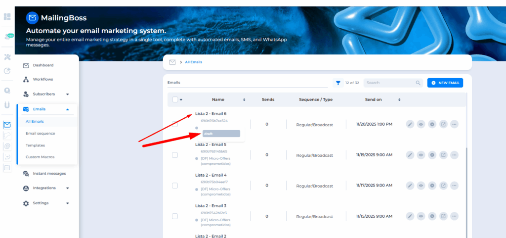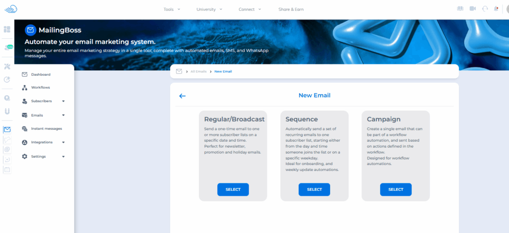 Before creating any email, you need to choose the correct type.
