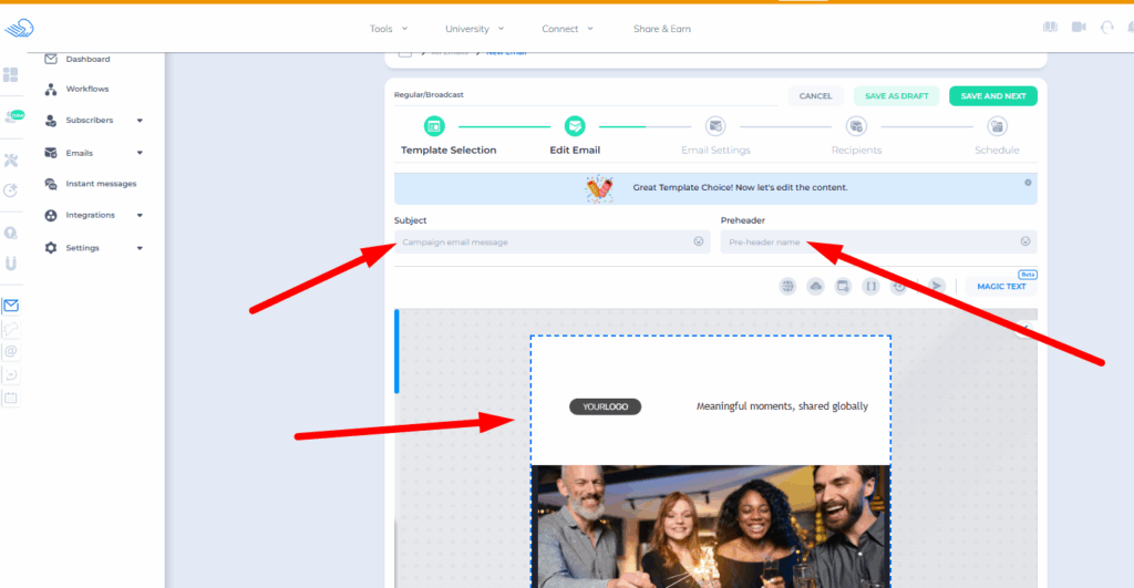 The email has a subject line, preheader, and content in the body