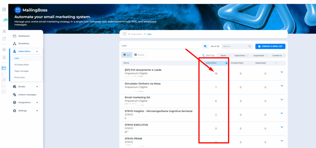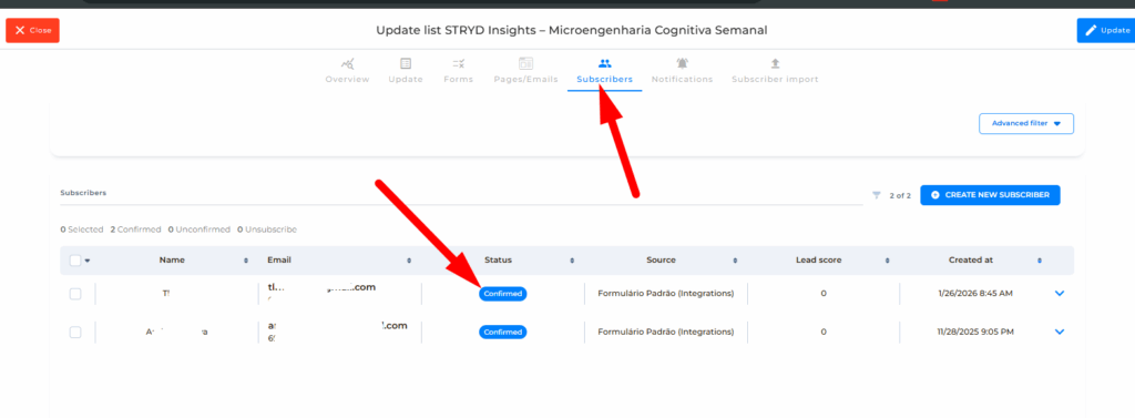 The list is active and contains confirmed subscribers
