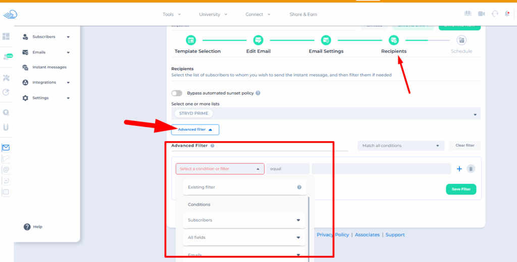 When you apply filters, you are restricting who can receive the email. If the conditions are too specific or conflicting, it may happen that no contact matches the criteria.