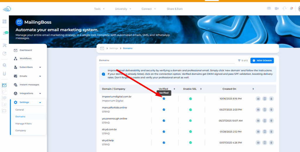 The sending domain is properly verified, with SPF, DKIM, and CNAME configured